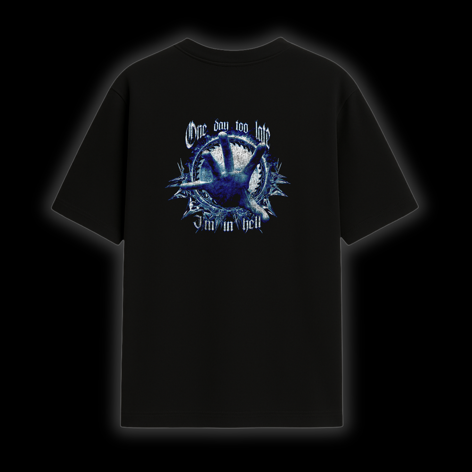 Wyraź swoje mroczne emocje z koszulką z unikalnym wzorem "One Day Too Late". Ta sugestywna grafika przedstawia wyłaniającą się z mrocznego wiru dłoń, otoczoną gotyckimi ornamentami i ostrymi kształtami. Napis "One Day Too Late" w stylizowanej czcionce dodaje całości poczucia spóźnienia i żalu. Dominująca niebiesko-czarna kolorystyka tworzy mocny i intrygujący nadruk na koszulce. Idealna dla osób ceniących mroczną estetykę, gotycki styl, motywy przemijania i żalu oraz ubrania z głębokim, emocjonalnym przekazem.