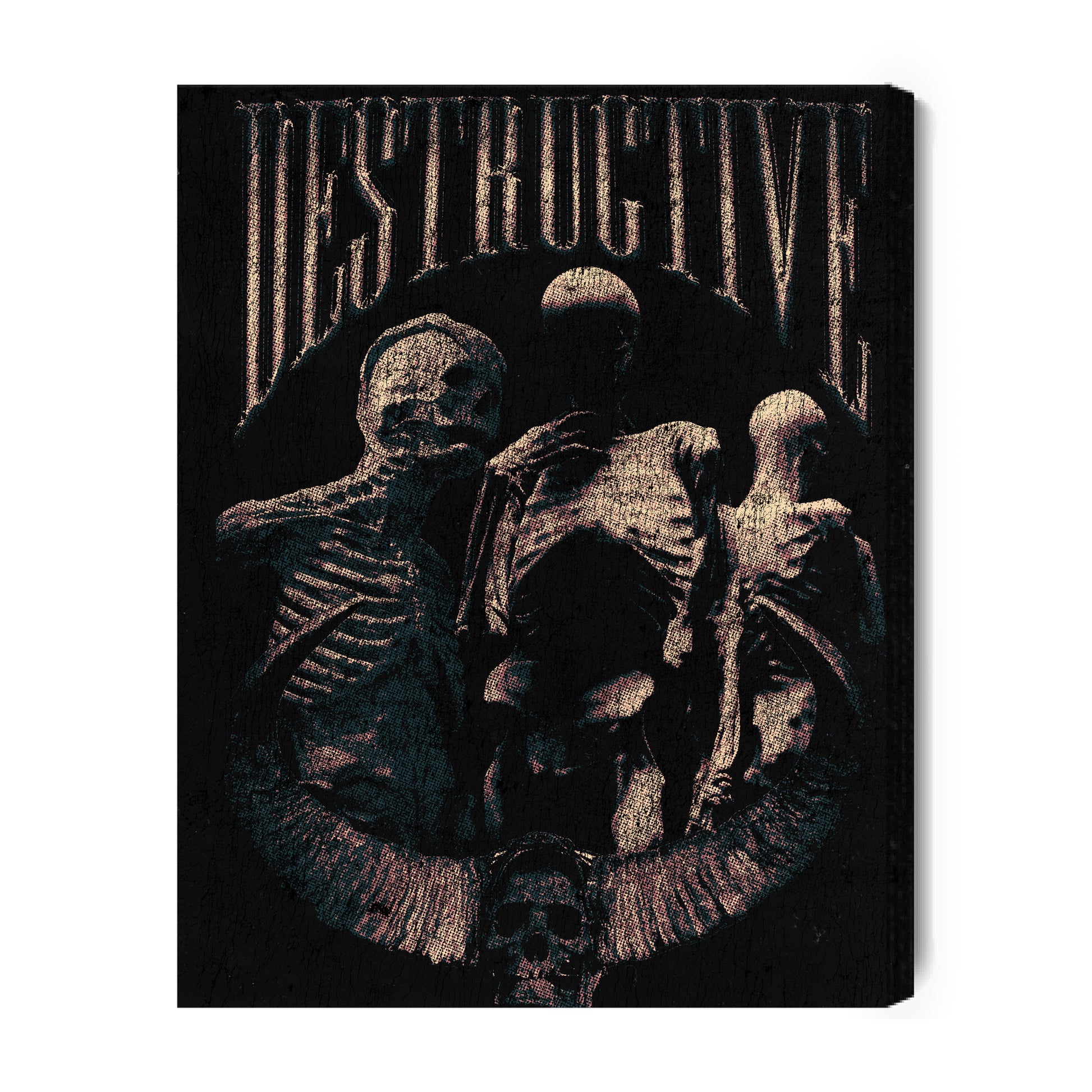 Odkryj przejmujący obraz na płótnie "Destructive", emanujący mroczną estetyką i surową mocą. Trzy szkielety dominują centralną część kompozycji. Nad nimi widnieje zniszczony napis "DESTRUCTIVE", potęgujący uczucie rozkładu i nieuniknionego końca. Ten obraz na płótnie to wyrazista propozycja dla miłośników mrocznej sztuki, estetyki gotyckiej, obrazów o tematyce śmierci i przemijania oraz dekoracji z charakterem.