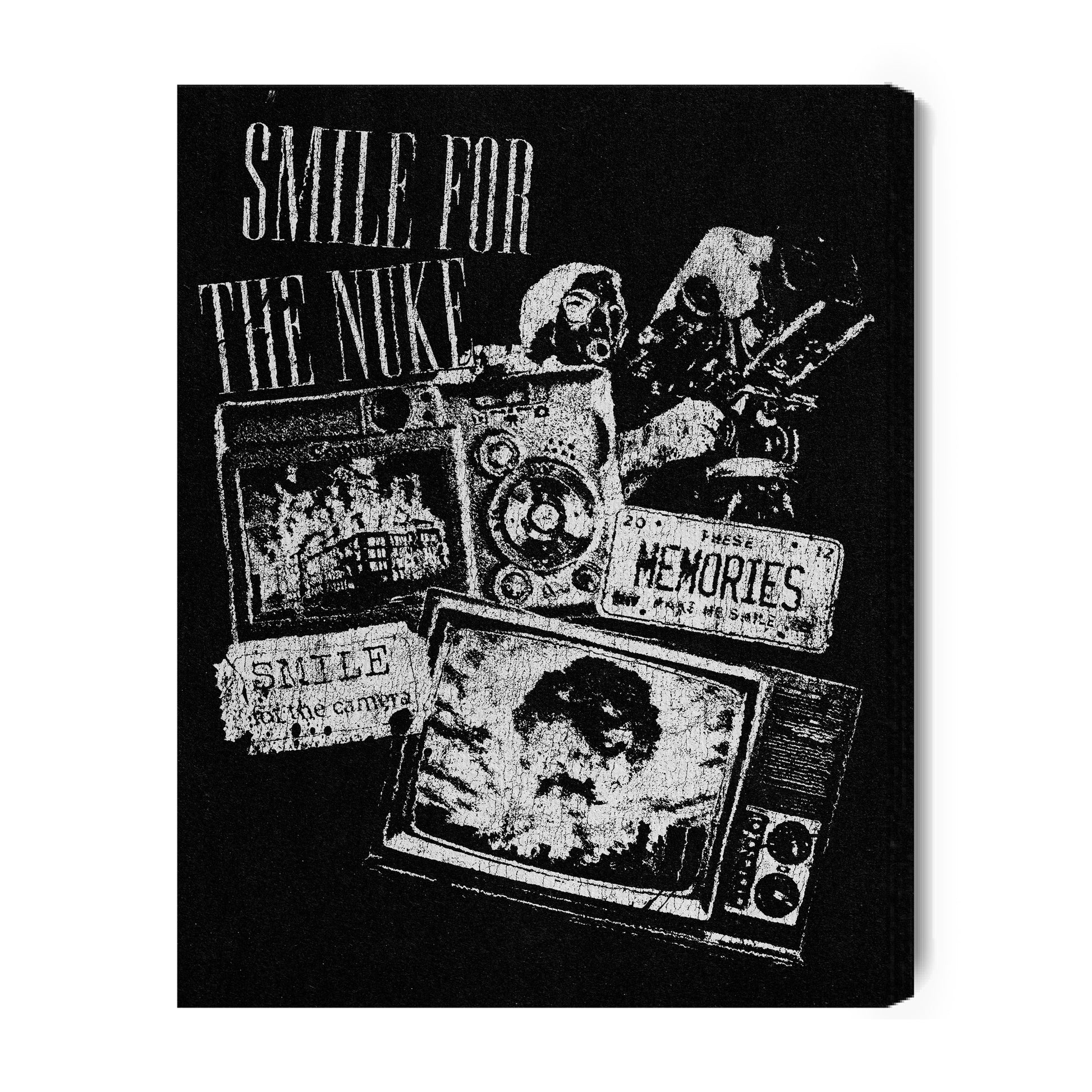 Obraz na płótnie "Smile For The Nuke" to nie tylko dekoracja, to wyraz Twojego unikalnego spojrzenia na świat i czarnego humoru. Nie czekaj, dodaj go do swojej kolekcji i zaskocz wszystkich niebanalnym akcentem!