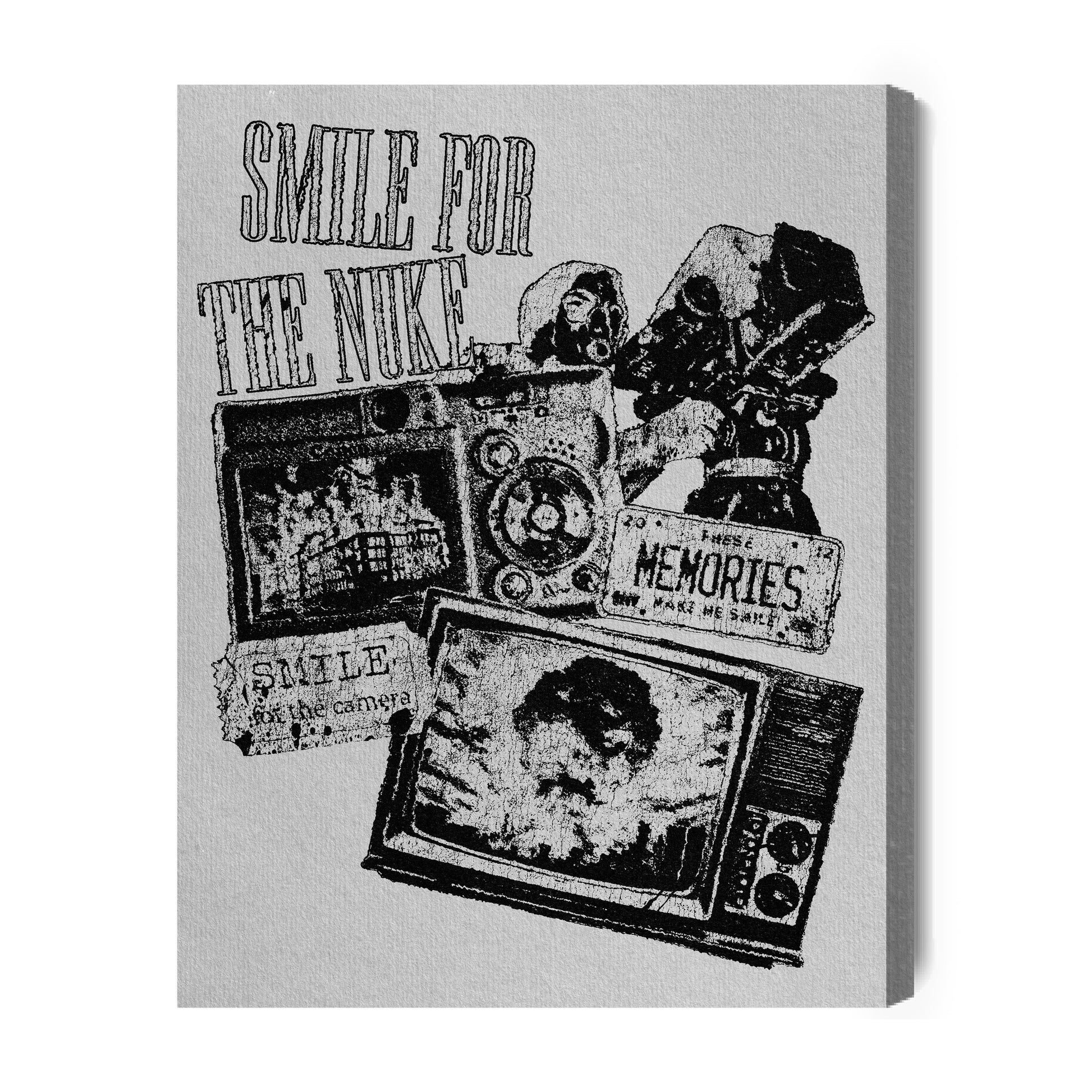 Obraz na płótnie "Smile For The Nuke" to nie tylko dekoracja, to prowokujący do myślenia komentarz na temat przyszłości i pamięci. Nie czekaj, zamów już dziś i dodaj swojemu wnętrzu unikalnego, ironicznego charakteru!